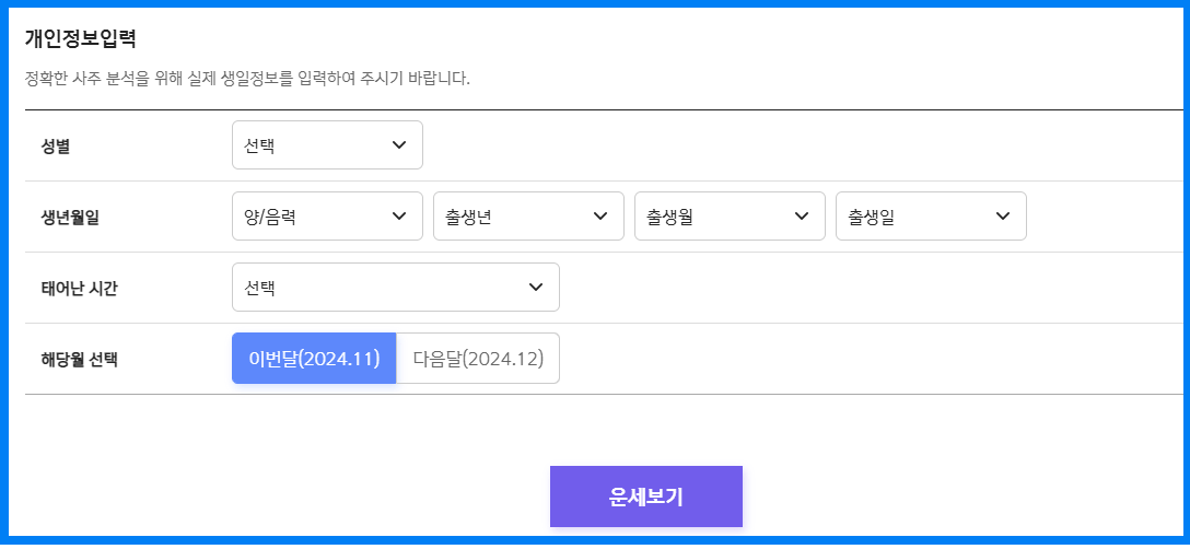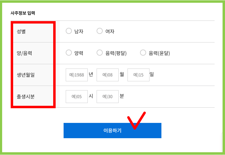 - 개인정보 입력 시 정확한 생년월일과 시간을 입력해야 정확한 운세 결과를 받을 수 있습니다